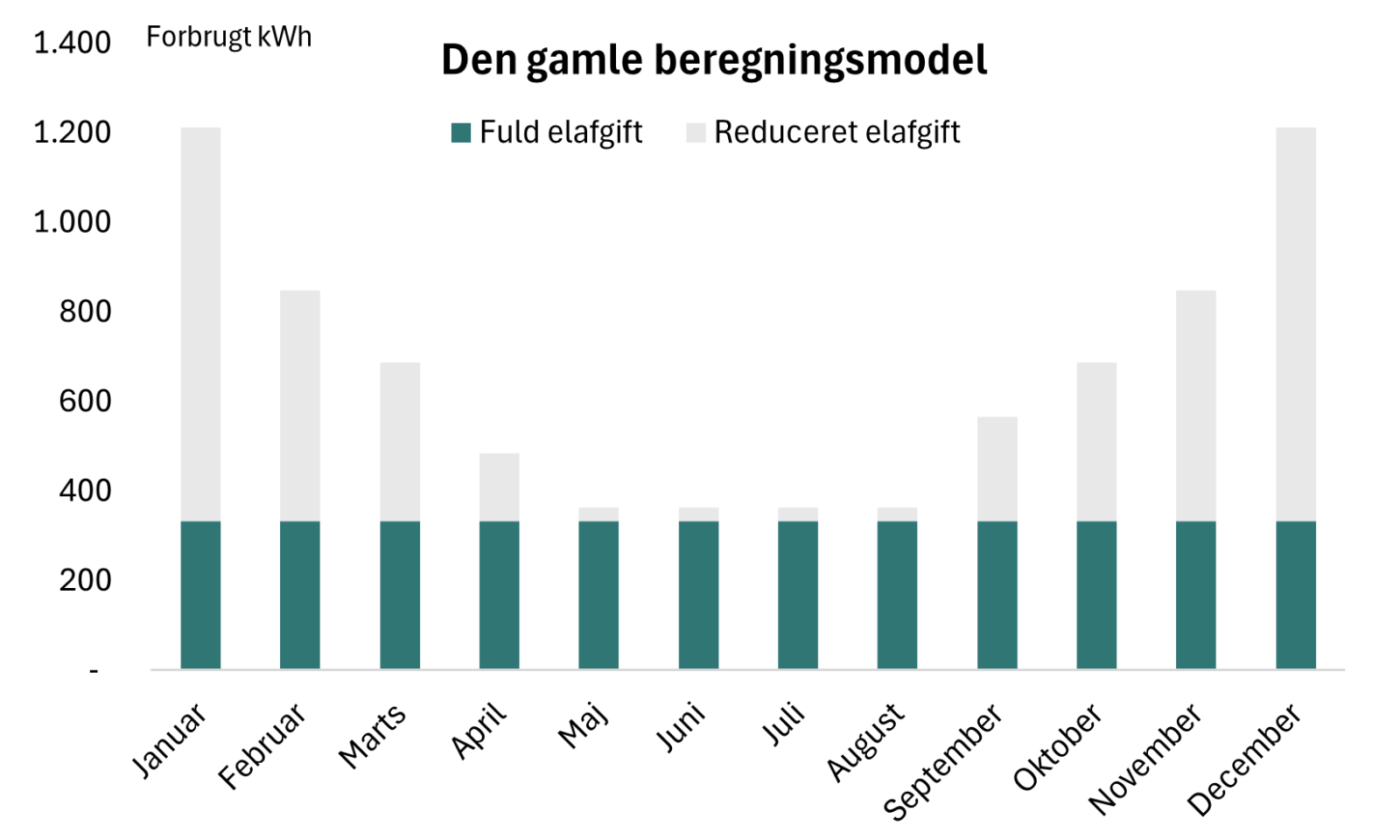 Her betalte du som kunde fuld elafgift af 4.000 kWh jævnt fordelt på 12 måneder svarende til en elafgift af 333 kWh pr. måned. Med en elafgift på 90 øre/kWh i 2025 (inkl. moms), vil det svare til 300 kr. pr. måned i elafgift for alle måneder.
