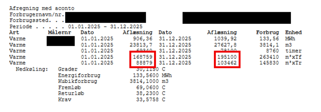 I den forbindelse er vi blevet opmærksomme på en visningsfejl på nogle regninger. Hvis du er blandt de berørte kunder, kan du opleve, at de måleraflæsninger, der er markeret med rødt på nedenstående eksempel, mangler et nul til sidst.