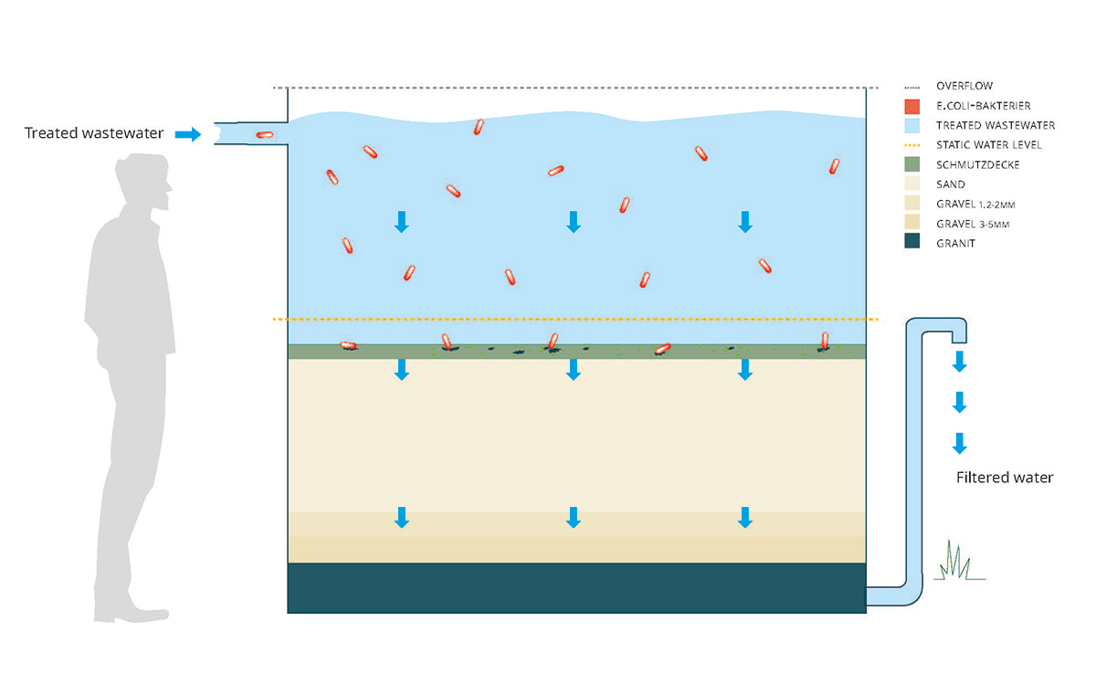 Som led i arbejdet tester vi på Svaneke Renseanlæg et ekstra rensetrin med sandfilter, der reducerer bakterier og forbedrer vandkvaliteten. Forsøget viser, at det rensede spildevand kan anvendes til vanding af foderafgrøder, hvilket vi har demonstreret gennem egne drivhusforsøg.