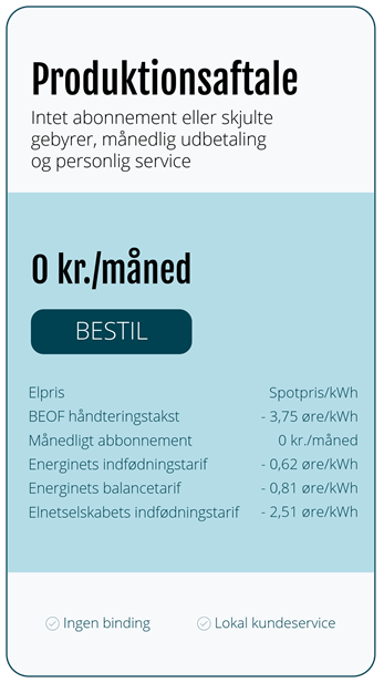 Så får du ikke betaling for den strøm, du sender ud på elnettet. Strømmen går stadig videre til andre – men uden en produktionsaftale går fortjenesten uden om dig. Så det kan godt betale sig at få aftalen på plads.