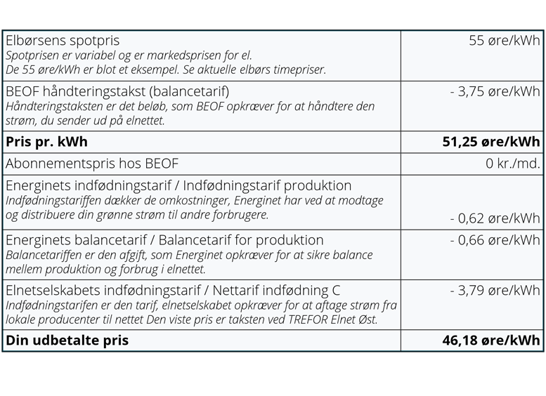Du får betaling efter elbørsens spotpris, fratrukket de lovpligtige gebyrer til Energinet, dit netselskab og vores håndteringstakst. Vi sørger for at trække det hele fra og udbetale resten til dig – nemt og gennemsigtigt. Se priseksempel her.